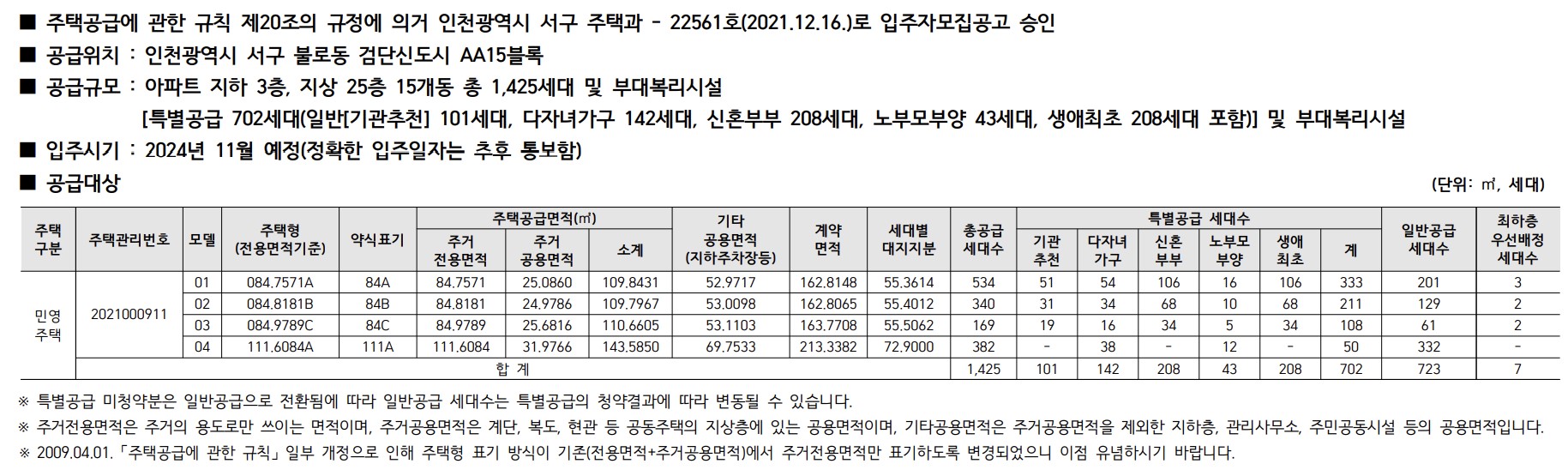 | 공급세대수 | 84m2 ~ 111m2 1,425세대 |
