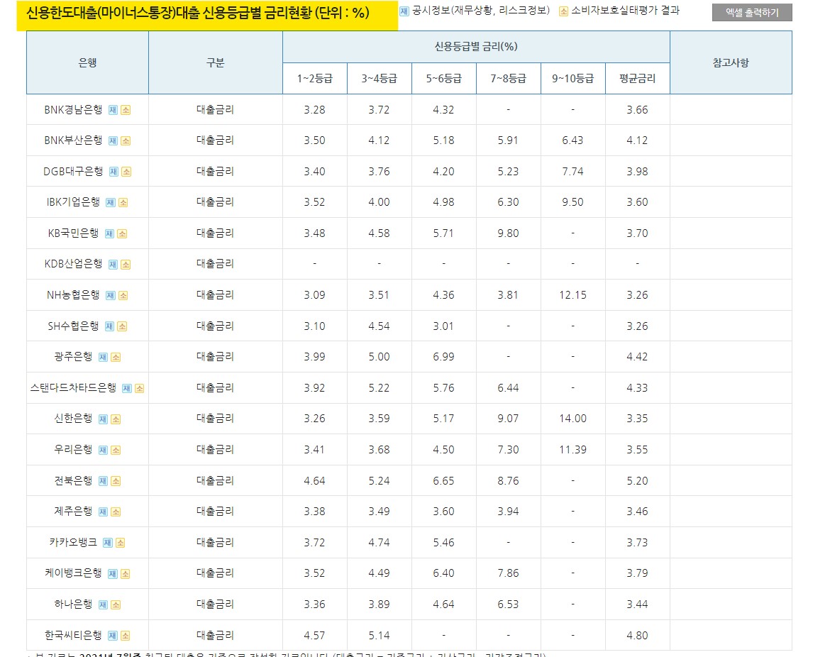 마이너스 한도 대출, 신용등급별 은행 금리 현황입니다. 올해 초에 비해서 금리가 많이 인상되어 3% 이하로 사용은 어려워진 상태다. 은행별 금리는 상이하니, 꼼꼼하게 비교하여 개설을 하길 권장한다. (현재는 대부분 3% 후반대로 이용이 가능해진 상태이다. )