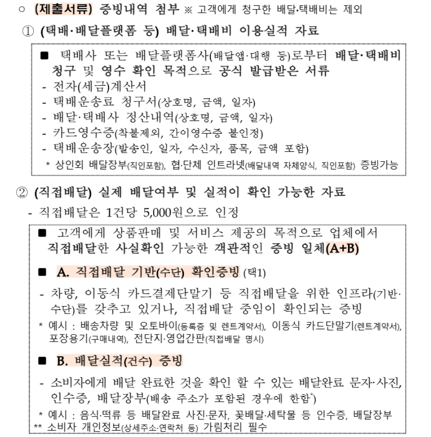 | 택배,배달플랫폼 등 | 전자세금계산서, 카드영수증,택배운송장 등 이용실적 제출 증빙 서류 |