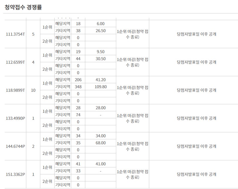 프리미엄 타입 모두 높은 경쟁률을 기록하였습니다. 아쉬운 점은 133P, 151P 기타 지역은 배정된 물량이 없음에도 불구하고 약 100명이 청약을 신청하였습니다. 청약 전 우선공급물량, 추첨제 물량 등 관련 내용을 꼭 꼼꼼히 살펴보시길 바랍니다.