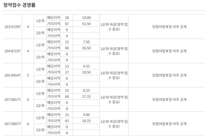 105T 해당 지역 경쟁률은 4.33 대 1, 103T 기타 지역 경쟁률은 51대 1을 기록하였습니다. 해당 지역의 경우 꼼꼼한 분석을 통한 눈치 청약을 시도하였다면 높은 당첨확률이 있어 보입니다.