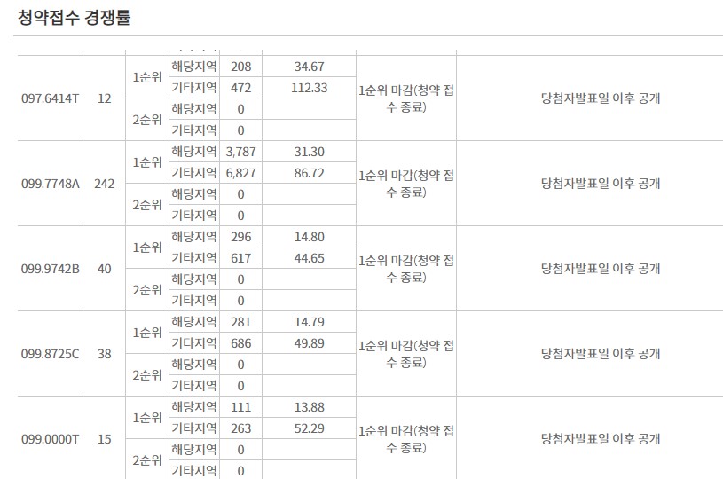 105T 해당 지역 경쟁률은 4.33 대 1, 103T 기타 지역 경쟁률은 51대 1을 기록하였습니다. 해당 지역의 경우 꼼꼼한 분석을 통한 눈치 청약을 시도하였다면 높은 당첨확률이 있어 보입니다.