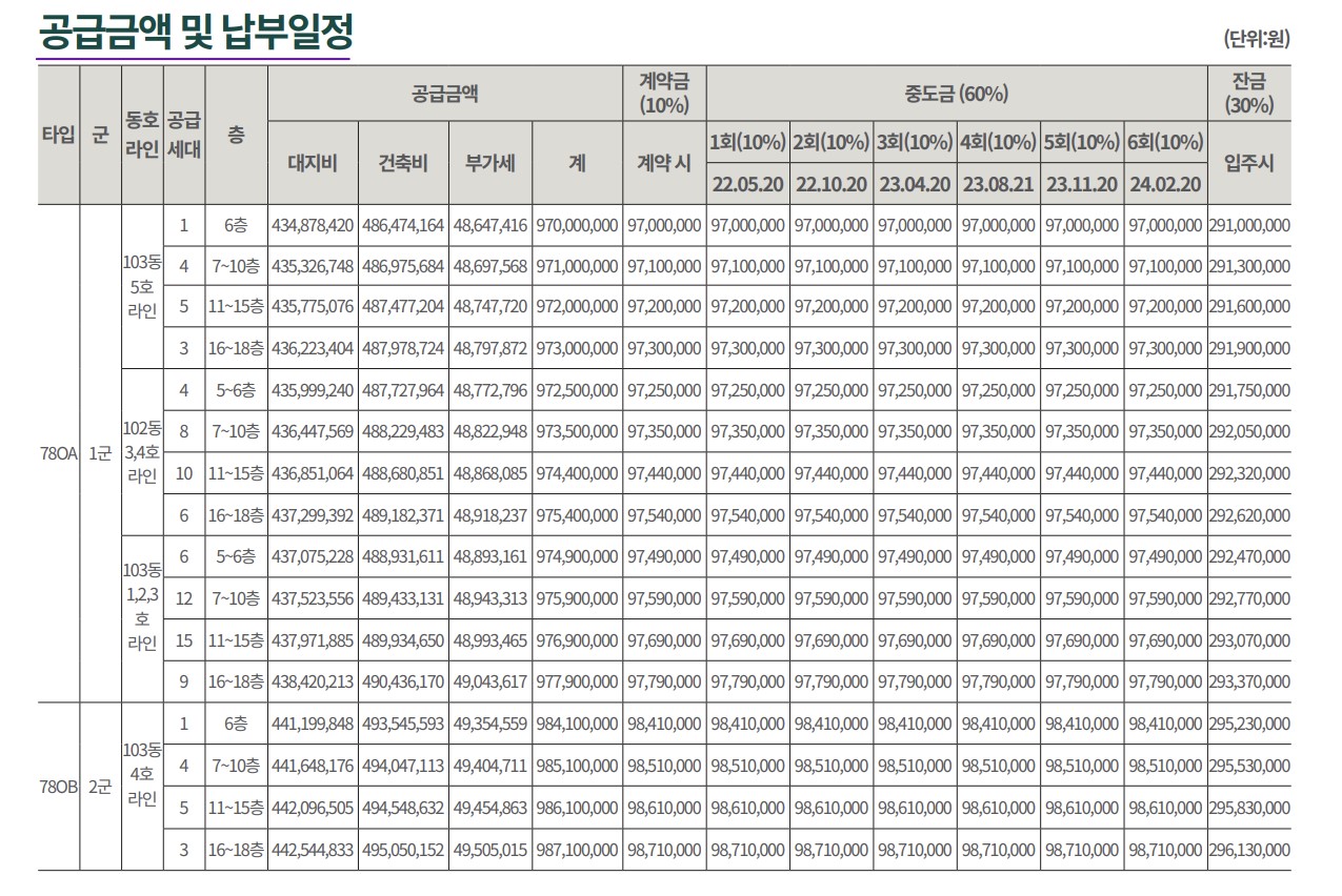 | 계약금 10%, 중도금 60%, 잔금 30% [ 주동금 무이자 대출 시행] | |