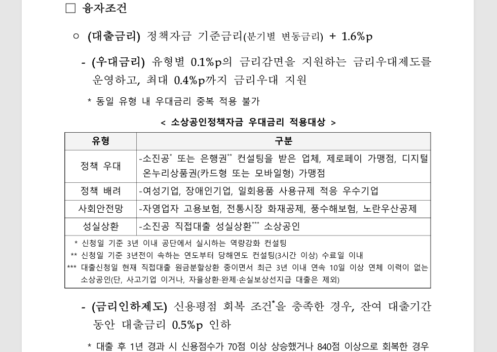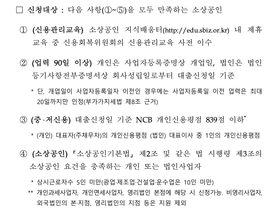 | 지원대상 | 소상공인 지식배움터 - 신용관리교육 사전 이수 필수 |