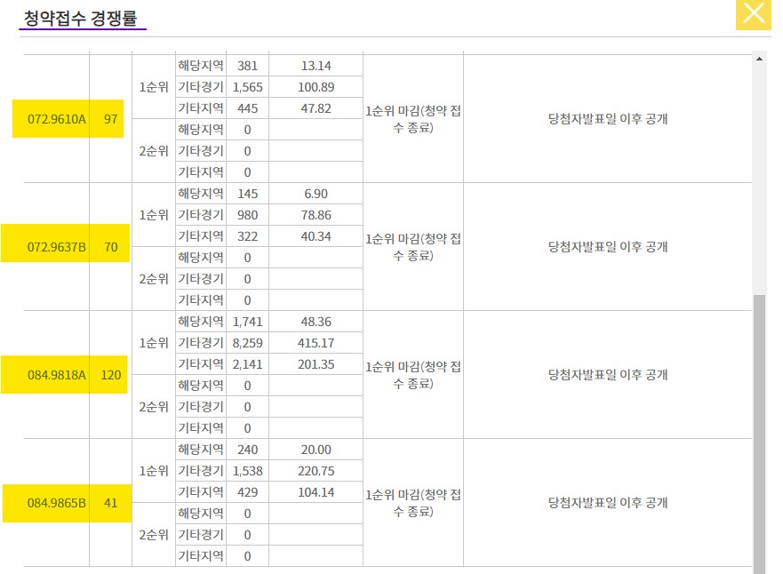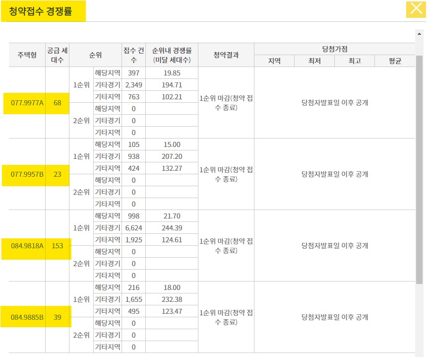 84A 타입의 경우 기타 경기 8천 명, 수도권 2천 명 등 120세대를 공급하는 평형에 무려 1만 2천 명이 청약을 신청하였다. 이에 최고 경쟁률 415 대 1을 기록하였다. 무의미한 수준이지만, 추첨제 물량을 노리는 경우 세대수가 많은 것보다는 적은 평형이 당첨 확률이 미세하지만 높은 경우가 많은 듯하다.