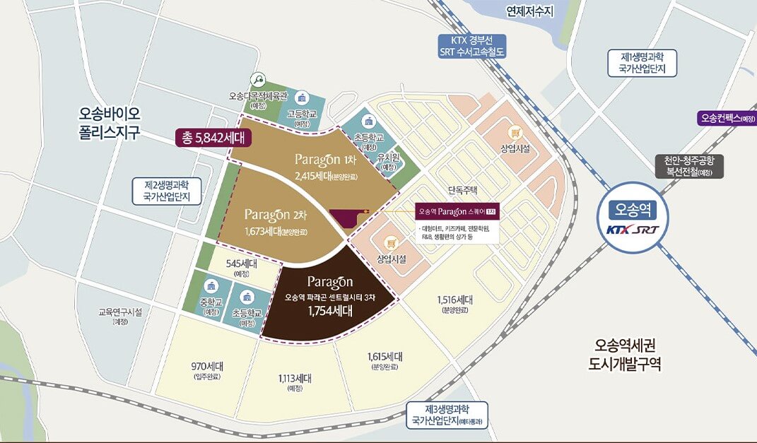 청주시 흥덕구 오송읍 봉산리에 위치한 [오송역 센트럴시티 파라곤 3차] 지상 25층 15개 동 1,754세대 규모입니다. 파라곤 1~3차 총 5,842세대의 미니 신도시급 대단지를 형성합니다. 8년 민간임대아파트로 공급을 합니다. KTX 오송역에 인접한 단지로 서울까지 40분이면 이동이 가능합니다. 주변 일대에 초중고교가 예정이 되었있는 학세권 단지입니다. 단지 바로 앞 상업시설이 예정되어 있으며, 오송 바이오폴리스 지구 등 직주근접 일자리 호재가 있습니다. 미래가치가 높은 입지를 자랑합니다.