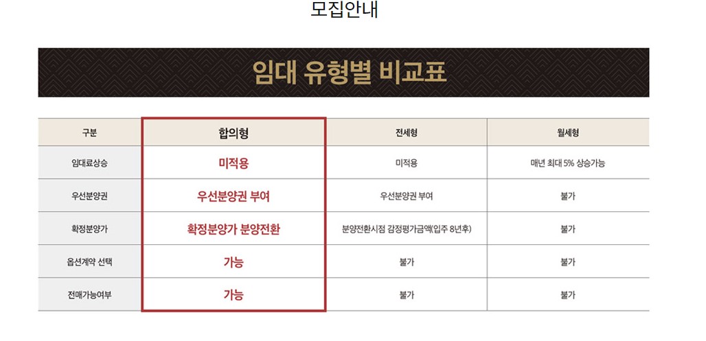 확정분양가로 우선분양이 가능한, 합의형으로 계약을 진행해야 합니다. 8년 민간임대주택으로 분양전환 전까지 임차인의 신분을 유지할 수 있는 장점이 있습니다. 현재 높은 인기로 호가는 계속 오르고 있다고 합니다. 꼼꼼히 체크하시길 바랍니다.
