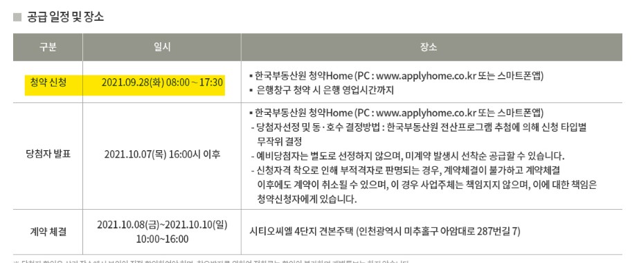 입주자 모집공고일 9월 17일, 청약일은 28일이다. 거주지역 무관, 청약통장 무관 대한민국에 거주하는 만 19세 이상이라면 누구나 청약이 가능하다. 100% 추첨제로 당첨자를 선정하며, 인천시 거주자에게 20% 우선공급을 한다. 청약 신청금은 300만 원이 필요하며, 당첨, 계약 여부와 관계없이 신청금은 10월 8일 이후 순차 환불할 예정이다.