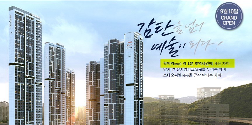 인천 학익동에 위치한 시티오씨엘 4단지는 지상 47층 5개 동 764세대 중 428세대를 아파트로 공급한다. 수익분 당선 학익역이 예정되어 있으며, 100m 이내 초 역세권의 입지를 자랑한다. 도보권 가능 학권으로, 추후 창조혁신지구 등 일자리 창출 가능성이 높은 부분을 호재라고 할 수 있다.