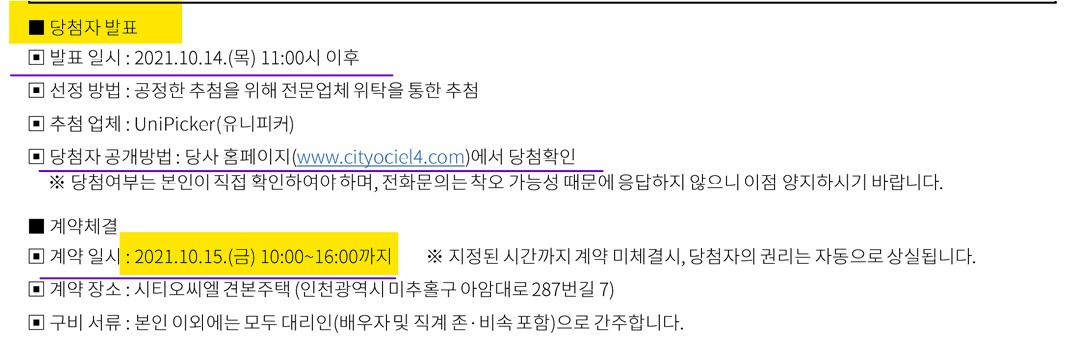 공정성을 위해서 전문업체 위탁으로 당첨자를 추첨으로 선정합니다. 10월 14일 당첨자 확인이 가능하며, 당첨자는 15일 견본주택에 방문하여 계약을 처리해야 합니다. 예비당첨자는 500% 선정하며 당첨 후 미계약 시 페널티가 없습니다.