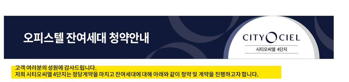 인천 시티오씨엘 4단지 오피스텔 모델하우스(홈페이지) 인천 시티오씨엘 4단지 아파텔, 잔여세대가 46세대에 대한 추가 입주자 청약이 마감되었다. 10월 14일 당첨자를 발표하였으며, 모델하