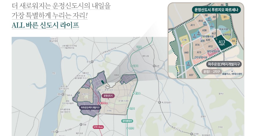 경기도 파주시에 위치한 운정신도시 푸르지오 파르 세나는 지상 25층 20개 동 1,745세대를 공급합니다. 반경 500m2 내 초중고가 예정 도보권 학군이 조성되어 있습니다. 단지 옆에는 상업시설이 예정되어 있으며, 홈플러스 롯데시네마/아웃렛 등이 인접해 있어서 편리한 생활 인프라를 누릴 수 있습니다. 향후 GTX-A, 3호선 연장이 계획되어 있어 현재보다는 미래가치가 높은 지역이라고 할 수 있습니다.