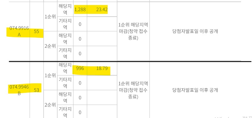 인기가 높은 A타입은 23대 1 , B 타입은 18대 1의 경쟁률을 기록하였다. 59 타입과 비슷한 경쟁률로 나타났다.