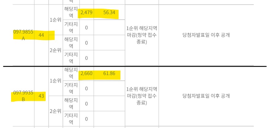 97 타입만 유일하게 B타입이 더 높은 경쟁률을 기록하였다. A타입은 56 대 1 , B 타입은 61대 1의 경쟁률로 나타났다.