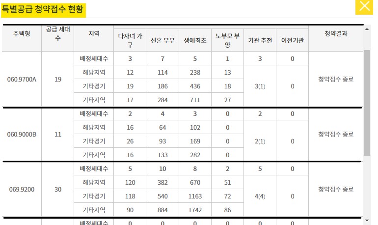 중도금 대출 불가하여 최소 7억 이상의 현금을 보유해야 한다. 그럼에도 불구하고 정말 많은 분들이 청약을 하였다. 특히 생애최초 특별공급 69m2 타입은 단 8세대에 무려 3만 명이 청약을 하였다. 특별공급의 최고 장점은 예비번호는 100% 추첨으로 선정을 한다는 점이다. 특별공급 자격조건을 충족한 분들은 최대한 많은 단지에 청약을 하긴 권장한다.