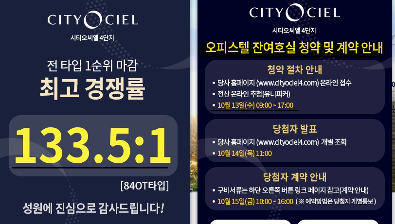 인천 시티오씨엘 4단지에서 무순위 청약, 줍줍 물량이 나왔습니다. 9월 30일 본 청약이 마감되었으며, 245가구 모집 약 1만 명이 청약을 신청하였으며, 84OT 타입은 최고 경쟁률 133 대 1을 기록하며 청약에 흥행을 하였습니다. 10월 10일까지 정당계약을 마감하였으며, 잔여호실이 발생하여 무순위 청약을 진행합니다. 또 한 번의 기회, 인천 시티 오씨엘 4단지 도시형 생활주택 무순이 청약, 줍줍에 대해서 알아보겠습니다.